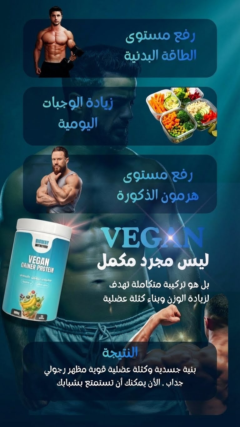 منتج نباتي متكامل عبارة عن بروتين متعدد المصادر، الحبوب، والطحالب والأعشاب، مصمم للرجال لزيادة الوزن وتضخيم الكثلة العضلية بطريقة صحية وطبيعية.